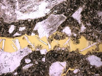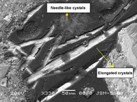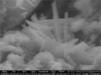 一旦反應被激活可以沿著混 凝土的裂縫看到粗糙長晶體 和細小針狀晶體的生成。晶 體完全封堵住裂縫,降低混 凝土滲透性,提供防水保護 | BEI拍攝的與上圖相同 裂縫表明澎內傳系統 生成晶體正在密封該裂縫 | 放大的圖片清楚地顯示 裂縫中的粗糙長晶體 和細小針狀晶體 | 放大10,000倍后可以看到 這些晶體是怎么形成的 |